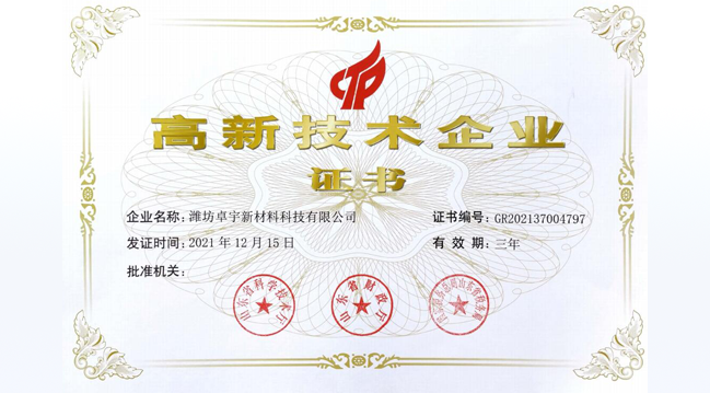 濰坊卓宇新材料科技有限公司重視產(chǎn)品質(zhì)量,不斷完善質(zhì)量檢測(cè)手段,保證產(chǎn)品質(zhì)量的穩(wěn)定提高。 我們始終堅(jiān)持“質(zhì)量優(yōu)良,信譽(yù)誠信”的至誠至信經(jīng)營方針......
